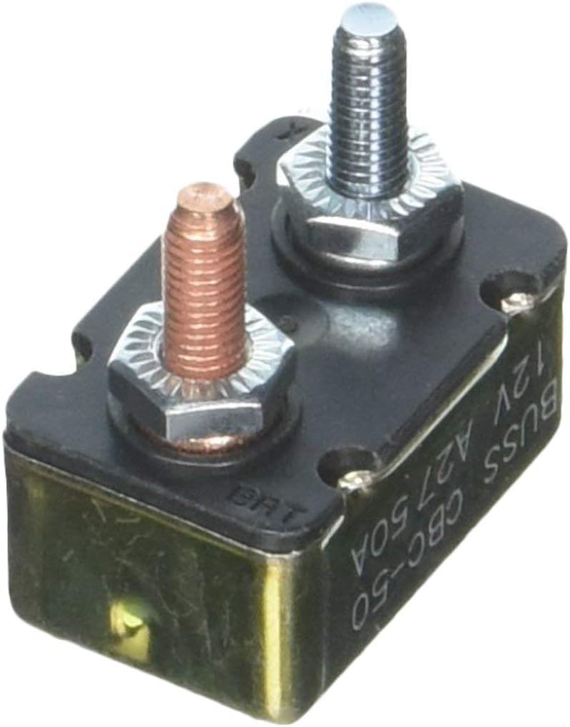The Bussmann CBC-50 is a 50-amp, 14V DC, Type 1 heavy-duty automotive circuit breaker with an automatic reset feature, ideal for trucks, RVs, marine systems, and other heavy-duty electrical applications.