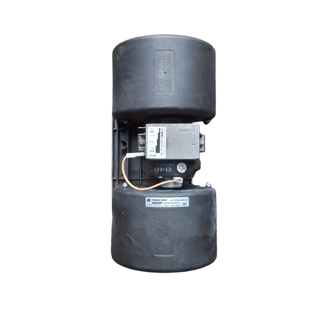 This is a 24V DC evaporator blower with four-speed resistor, designed for Thermo-King HVAC units and Yutong buses, offering reliable performance, 1050 m³/h airflow, and compact dimensions.